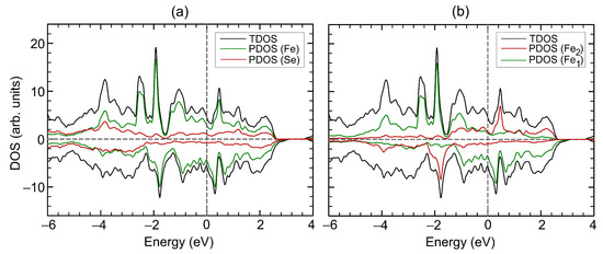 Total (TDOS) and partial (PDOS) densities of states for FeSe under 7% (a) and 14% (b) compression. Positive and negative values corresponds to spin-up and spin-down channels, respectively. The Fermi level corresponds to zero.