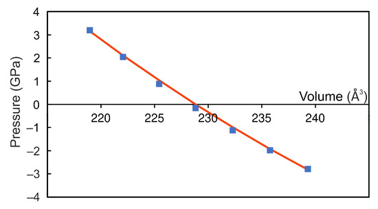 Pressure as a function of FeSe volume. Blue dots indicate values for structures with finite strains , , %. The curve through this values fitted to the Birch–Murnaghan equation is marked by red.