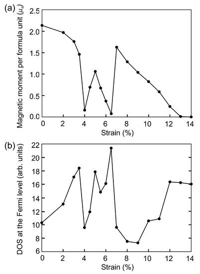 Calculations of atomic and electronic structure and magnetic properties were performed in the framework of density functional theory using the Vienna ab initio simulation package (VASP) [18]. Exchange-correlation effects were described by the Perdew–Burke–Ernzerh (PBE) of generalized gradient approximation (GGA) [19]. The ion-electron interactions were represented by the projector-augmented wave method (PAW) [20], and the plane-wave cutoff energy of 600 eV was applied. The criteria for the total energy minimization and interatomic forces were set to eV and eV/Å, respectively. The energy convergence criteria were decreased to eV to obtain a more accurate electronic structure. The first Brillouin zone (1BZ) was sampled by grid using the Monkhorst–Pack scheme [21]. The isotropic compressive strain was modelled as the change of the structural parameters. The value of strain is defined as , where and l are the equilibrium and strained lattice constant, respectively. The strain was uniform on three lattice directions, i.e., all lattice constants a, b, and c were changed at the same time by the same value of . The strained lattice constants did not change during the geometry optimization. Compressive strain ranging from 0 to 14% is considered. The lattice shape remains unchanged during the compression. Compression by an isotropic pressure was studied by adding the external pressure to the diagonals of stress tensors. The value of the external pressure was changed from zero up to 8 GPa. Lattice constants, cell shape, cell volume, and ionic positions were optimized for these structures. The Visualization for Electronic and Structural Analysis (VESTA) [22] software was used for representation of atomic structures. The “vaspkit” software [23] was used for post-processing.