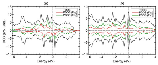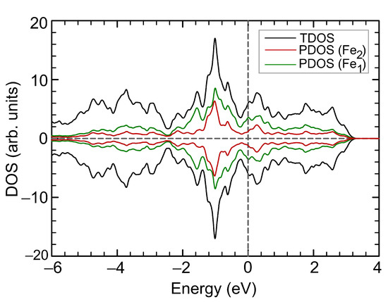 DOS at the Fermi level correlates with the non-monotonic dependance of the total magnetic moment, see Figure 7b. A decrease in the total magnetic moment is accompanied by an increase in the . A change in the magnetic order from ferrimagnetic to ferromagnetic leads to a decrease in that was also observed in the structure under compression by the isotropic strain. The electronic structure of FeSe remains metallic at all values of external pressure. DOS with spin-up and spin-down become equal on each Fe cation under 8.0 GPa (Figure 8), resulting in a paramagnetic state. DOS in the vicinity of the Fermi level are increased compared to the DOS of the original structure shown in Figure 2b. DOS redistribution in this case differs from that for the paramagnetic FeSe structure at 14% compressive strain, since the structural parameters change differently.