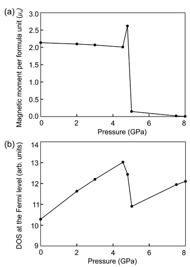 Second approach to studying the effect of compression of FeSe cells is to apply the isotropic pressure by adding the external pressure to the diagonals of the stress tensors. The results of calculations show that the cell shape of FeSe does not change over the entire interval of the external pressure. Lattice constants vary nonuniformly because the cell is anisotropic, see Table 4. The lattice constant c decreases faster than a and b due to the presence of vacant layers. As a result the Fe–Se bonds and the magnetic moments on Fe atoms decrease rapidly, see Table 5 and Table 6. This difference is not so significant when the cell is compressed by small pressure. The c constant changes by more than 7% at an external pressure of more than 4.8 GPa. At the same time, the b constant is slightly increased compared to the original structure. In this case, the magnetic moments on iron in both sublattices are co-directed and oppositely directed to the magnetic moments on the Se ions, which are equal to and . This ferrimagnetic ordering is accomplished by the through-bond spin polarization. Iron atoms with a spin-up density induce a spin-down density on the adjacent Se atoms. This leads to an increase in the magnetic moment by . An increase in pressure up to 5.0 GPa leads to the disappearance of magnetic moments on Se atoms and the magnetic order of FeSe becomes ferromagnetic. Then, the total magnetic moment decreases with increasing external pressure that is associated with a further decrease in bond lengths, see Table 5. At a pressure of 5.0 GPa, the value of the magnetic moment sharply decreased from to since the Fe–Se bond lengths starts to decrease faster than previously. The magnetic order disappears and the magnetic moment becomes zero at a pressure of 8.0 GPa. The Fe–Se bond lengths are 2.02–7.59% shorter compared to those in the original structure. The distances between selenium atoms near the vacancy decrease by 8.9 and 6.0%. Se–Fe–Se angles are equal to , , , and . Se–Fe–Se angles are and . Selenium atoms located at opposite corners of this octahedron remain in the same plane. The volume of the cell is 201.61 Å. Thus, the spin crossover in the monoclinic phase of FeSe occurs faster under compression by the isotropic pressure compared to by the isotropic strain. The dependence of the total magnetic moment under compression by an external pressure is shown in Figure 7a.