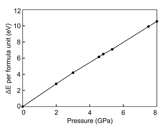 The energy difference per formula unit between compressed and original FeSe was calculated as . Here and are the total energy of the FeSe cell under isotropic compression and the total energy of the non-compressed FeSe cell, respectively. The dependence of on compressive strain is shown in Figure 6. The increase in the energy is described by the cubic polynomial . The structure at critical points of 7 and 14% is higher in energy by and eV/f.u., respectively.