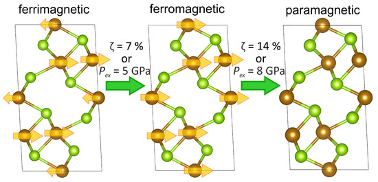 Illustration of the FeSe transformation under the applied isotropic strain or the isotropic external pressure between the ferrimagnetic and the paramagnetic states through the ferromagnetic state. Brown and yellow-green colors correspond to Fe and Se atoms, respectively. The arrows indicate the direction of magnetic moments on iron atoms.