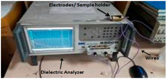 To study the practical application of the prepared samples, dielectric spectroscopy was carried out by investigating the complex permittivity in the frequency range from 100 Hz to 5 MHz. The log–log graphs were drawn for the sake of simplicity. Complex permittivity comprises the real part () and imaginary part (), and it is given in Equation (1):