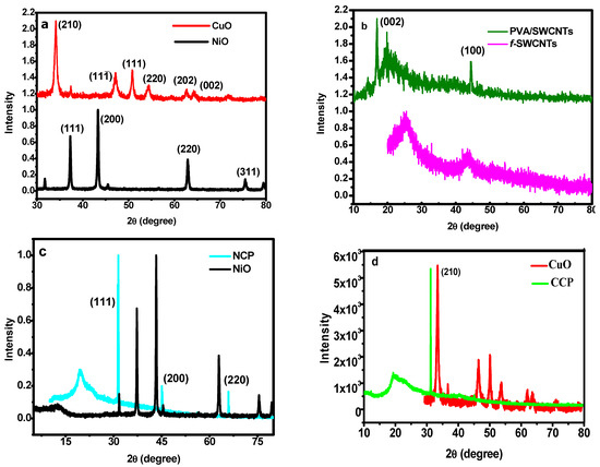 In the case of NiO, the diffraction peaks are observed at 20°, 37.2°, 43.2°, and 63.0°, and they can be related to the (111), (200), and (220) planes, respectively, and this can be indexed to the JCPDS 78-0429 [32]. These results clearly indicate the cubic structure and Fmm space group. Similarly, in the case of CuO, no additional impurity peak can be observed. The XRD pattern can be well indexed to the monoclinic structure and the JCPDS 80-1268 [33]. The peak broadening can be attributed to the small size of the particles. The XRD pattern of the pure functionalized SWCNTs and the composite of the SWCNTs/PVA were compared to investigate whether any structural change occurred, as shown in Figure 2b. The structure of the SWCNTs remained intact, and, in the XRD of the composite, the peaks of all the constituents can be observed. Finally, the XRD analysis of the MO/SWCNT/PVA composites was also carried out to ensure the structural persistence of each component in the composite. The XRD patterns of NiO/SWCNTs/PVA (NCP) and CuO/SWCNTs/PVA (CCP), in comparison with pure NiO and CuO, are shown in Figure 2c,d, respectively. It can be clearly observed that the MO crystals perfectly aligned towards one plane, which is evidence of a fine dispersion and homogenous orientation. The peaks for all the components, including PVA, can be observed [34].