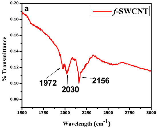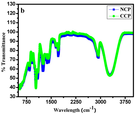The FTIR analysis presented in Figure 3a is evidence of the successful purification and functionalization of the SWCNTs. An intense band of nitrile (−C≡N) was observed near 2030 cm−1, and a C=O band at 1972 cm−1. Various bands of nitrates were observed between 1738 and 2136 cm−1. A band of an aliphatic C–H stretch was also observed near 2156 cm−1. The data show the successful functionalization of the SWCNTs. FTIR analyses for the NCP and CCP composites were also carried out and are shown in Figure 3b [35]. All the characteristic bands of each constituent can be seen in the IR spectra of the composites [32,33,36].