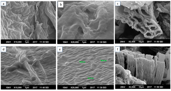 The dispersion of MOs and alignment of the SWCNTs was analyzed by SEM. Figure 4 shows the SEM micrographs of the NCP and CCP, analyzed at different resolutions. Figure 4a,b presents the micrographs of the NCP at magnifications of X10,000 and X20,000, respectively. These images were taken at a specimen distance of 1 µm, and at voltages of 20 kV and 10 kV for a and b, respectively. It was necessary to proceed with the analysis at a lower voltage to avoid the film rupturing. In Figure 4c, with a specimen distance of 10 µm, a clear image of the zigzag CNT is observed. Figure 4d–f shows the composite CCP with a homogeneous dispersion of f-SWCNTs. For Figure 4e, the diameter was calculated, which ranged from 44 to 88 nm for the zigzag SWCNTs dispersed in the PVA. The SEM micrographs show the zigzag morphology and alignment of the SWCNTs, which resulted in a very fine dispersion. The SWNTs have uniform dimensions and embedment throughout the polymer matrix, as shown in Figure 3.