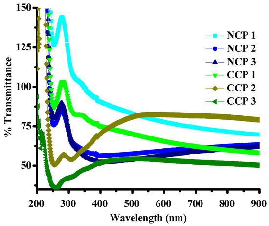 The optical properties, including the transmission and molar absorption coefficients of the composites, were investigated by using UV–VIS spectrophotometry. The effects of the metal oxides and SWCNTs on the bandgap energies were thoroughly investigated by plotting Tauc’s plots for all the composites. It is clear from Figure 6 that the transmittance of the composites is inversely proportional to the concentration of SWCNTs and MOs.