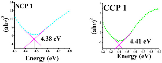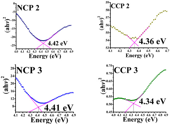 The bandgap energies were calculated by plotting the absorbance coefficient ((ahv)2) versus the energy (hv), as shown in Figure 7.