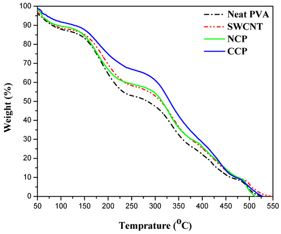 Thermogravimetric analysis was employed to assess the thermal stability of the CNPs and CCPs with the highest concentrations of nanofiller, and their comparison with neat-PVA and SWCNT thin films is given in Figure 8.
