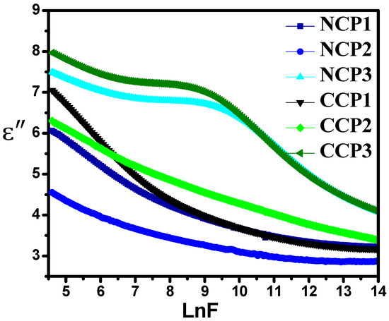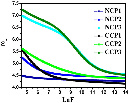where C is the capacitance, d is the thickness (nm), A is the surface area (m2), and . A significant change in the value with the change in frequency can be seen in Figure 9. This change is due to the dipolar charge carriers among the two isolated states. It was observed that, with the increase in the frequency, the real part of the permitivity of the material decreased, as the dipoles were unable to align themselves due to the relaxation process, along with the field at a high frequency [44]. It is evident from the Figure 9 that the addition of the filler improved the dielectric behavior of the prepared films, with CCP 3 expressing the highest value of the . The increase in the value is due to the accumulation of mobile charge carriers at the interface of the filler polymer matrix.