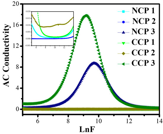 It is evident from Figure 11 that the conductivity of all the samples increased with the increase in the frequency, and then decreased in the higher range.