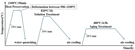 In recent decades, the microstructural and mechanical evolution and strengthening behavior of maraging steel have been extensively studied. Aging treatment promotes a drastic increase in strength along with a drop in tensile ductility. Bai YC et al. found that solution treatment (ST) and solution + aging treatment (SAT) have a significant effect on the microstructure evolution. ST reduces the microhardness and tensile strength. SAT can improve the microhardness and tensile strength significantly, and both fracture elongation and impact toughness are reduced [15]. The microstructure of maraging steel is mainly lath martensite and metal compound precipitation, and the changes in tensile strength and ductility are mainly affected by the strengthening precipitates and microstructure defects [16,17]. In addition, with the increase of ageing temperature, the spacing of precipitated phases would increase, leading to the improvement of cracking resistances of maraging steel [18]. The effect of aging time on the microstructure and mechanical properties of maraging steel was investigated by Zhu HM et al. Because of the combined contributions of precipitation strengthening and softening induced by formation of reverted austenite, the microhardness and tensile strength is first increased and then decreased [19]. Under over ageing conditions, the optimum microstructure of maraging steel is comprised of martensite with a large amount of metal compound precipitation and reverted austenite [20,21,22,23]. The reverted austenite exhibited the TRIP effect, which make maraging steel obtain a combination of high strength and ductility [24,25,26,27,28,29,30,31]. The influences of cyclic transformation α→γ on the grain size of the maraging steel was studied by many scholars. Cyclic phase transformation can significantly refine the grain size, which can improve the plasticity of maraging steel [32,33,34]. The research of maraging steel mainly focuses on the heat treatment, cyclic phase transformation as well as the types and functions of precipitated phases. But there are few studies on the microstructural and mechanical evolution and strengthening mechanism of maraging steel during forging deformation. The hot working behavior of maraging steel was investigated, and the optimized hot processing window was obtained [35,36,37,38]. The hot compression deformation behavior of 18Ni maraging steel was investigated by Ren YH et al., and the complete recrystallization region was obtained [39].