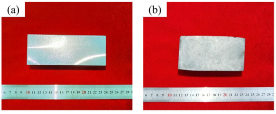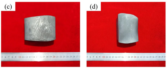 The upsetting deformation experiment was performed on the samples with a size of 125 mm × 50 mm × 50 mm under the pneumatic hammer. The samples were heated to the specified temperature at a rate of 15 °C/min and heat preserved for 1 h. Upsetting the samples to the specified deformation amount. Then the compressed samples were air cooled, which is convenient for subsequent mechanical property testing. The shape of the upsetting sample is shown in Figure 2.