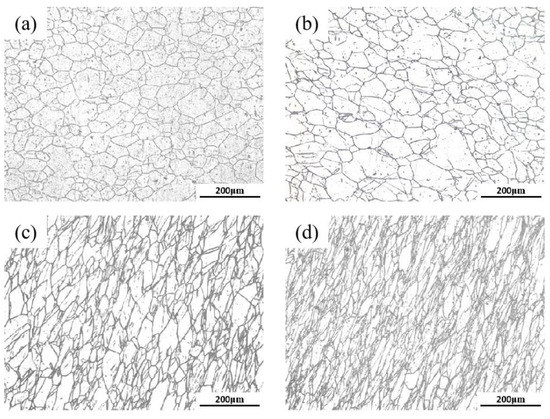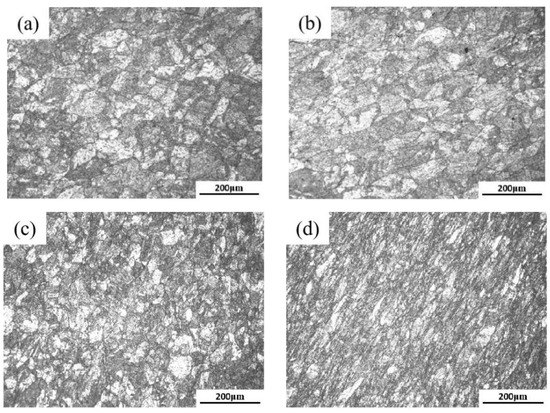 The metallographic photographs of C250 after deformation: (a) 15%; (b) 30%; (c) 45%; (d) 60%.