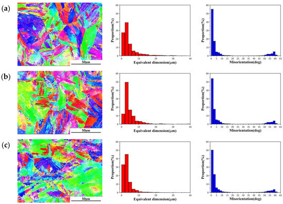 The distributions of grain boundary misorientation of 18Ni(250) steel under different forging conditions are shown in Figure 8. As the deformation amount increases, the proportion of low-angle boundaries less than 10° gradually decreases, from 83.3% to 76.65%, and the proportion of high-angle boundaries of 50° to 60° gradually increases. This means that as the deformation amount increases, the low-angle boundaries gradually transform into high-angle boundaries. Because a large number of dislocations are generated inside the grains during the deformation process, the motion of the slip system in different regions is different, and the sub boundary is gradually formed. The sub boundary in the austenite is the low-angle boundary; recrystallization that occurs at this position gradually transforms the low-angle boundaries into the high-angle boundaries [40].