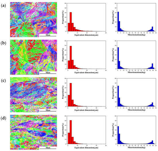 Since it is difficult to observe the substructure of martensite by optical microscope, the microstructures of martensite were characterized by EBSD, and the distributions of martensite laths with different deformation amounts are shown in Figure 8. The average size of the martensite lath was calculated by EBSD photographs, and the calculation results are shown in Table 1. As the deformation amount increases, the grain size and the average size of the martensite lath gradually decreases. It can be observed from Figure 8a,b that when the deformation amount is small, the arrangement of martensite lath is regular. The size of martensite lath is distributed between 1 and 36 μm, and most of the size of martensite lath is less than 15 μm, accounting for about 92.5%. When the deformation amount is 60%, the size of martensite lath is significantly reduced, most of the lath size is less than 10 μm, and the proportion of martensite lath less than 10 μm is about 98.2%, as shown in Figure 8c,d. This is because a large number of uneven deformed microstructures are generated in the 18Ni(250) maraging steel during deformation, and there are a large number of dislocations and internal defects, which causes recrystallization during the forging process. When the deformation amount is large, large plastic deformation occurs inside the metal, and the stored energy increased by strain provides the driving force for recrystallization. Due to the high distortion energy, fine grains are obtained after recrystallization. The high distortion energy can increase the nucleation rate of martensite transformation and promote the refinement of martensite laths. The plastic deformation has a restraining effect on the growth of martensite and has an indirect effect its refining [41]. There are higher densities of dislocation tangle in recrystallized grains, which prevents the growth of martensite lath, so the size of the martensite lath is reduced [42].