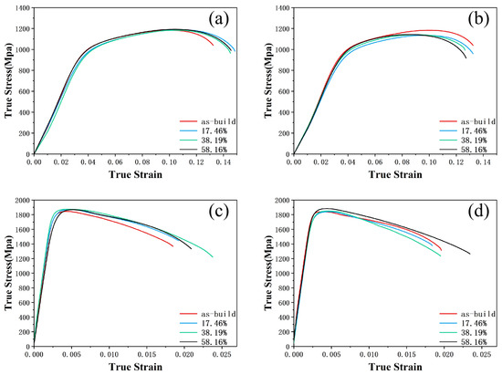 Tensile stress–strain curves of C250: (a) After deformation, CD; (b) After deformation, PD; (c) After heat treatment, CD; (d) After heat treatment, PD.