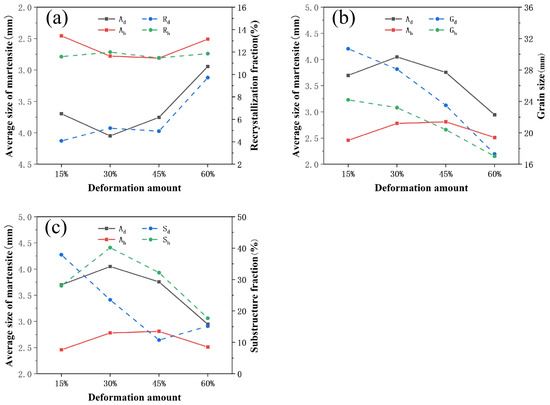 When the deformation amount increases from 15% to 30%, the substructure fraction increases, the grain size decreases, and the martensite lath size increases. Although a large number of substructures inhibits the martensite transformation, the refined grain has a promotion effect on the martensite transformation, which is a cause for the growing of the martensite lath. When the deformation amount increases from 30% to 45%, the substructure fraction is decreased, and the effect of inhibiting the martensite transformation is weakened. However, the sizes of the martensite lath are almost equal. It is indicated that the martensite transformation has already been inhibited at this grain size. When the deformation amount increases from 15% to 60%, the martensite substructure fraction and the grain size decrease, while the martensite lath sizes of two deformation amounts are equal. It is indicated that there is both the promotion effect of the reduction of the substructure fraction and the inhibitory effect of the reduction of the grain size.