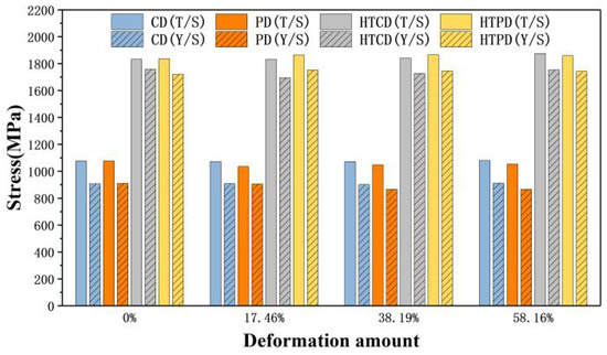 The tensile stress-strain curves of 18Ni(250) maraging steel under different deformation amounts and heat treatment conditions are shown in Figure 11. The compression direction is represented by CD, and the direction perpendicular to the compression direction is represented by PD. The 18Ni(250) maraging steel has higher ductility and lower strength before heat treatment, and the elongation is in the range of 13.8% to 16.3%, while the tensile strength is about 1065 MPa. When only thermal deformation is performed, as the deformation amount increases, the tensile strength in the compression direction increases by 9 MPa, that in the perpendicular to the compression direction increases by 19 MPa, and the elongation in both directions is similar after deformation. After heat treatment, the tensile strength of the material is increased to about 1860 MPa, and the elongation is reduced to about 2%.