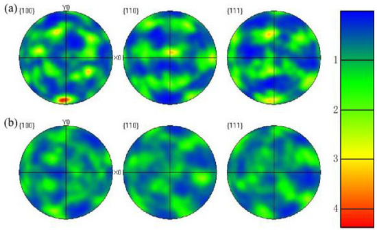 EBSD pole figures of C250: (a) After deformation; (b) After heat treatment.