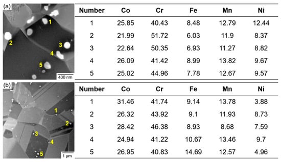 STEM HAADF image and the EDS analysis of the (a) cold-rolled and heat-treated at 973 K for 30 min (HT1) and (b) 1023 K for 30 min (HT2) Co35Cr25Mn15Ni15Fe10 HEA.