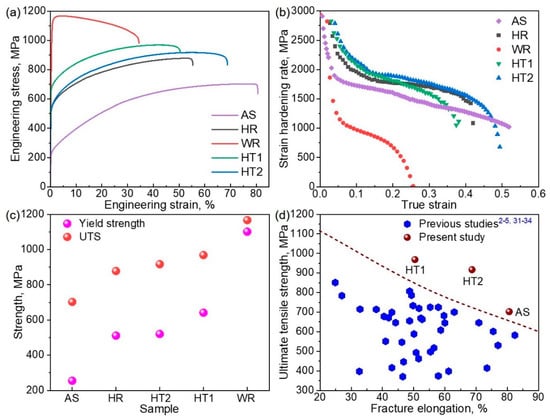 To clarify how the microstructures affect the strength and ductility of HEA, room-temperature tensile tests were conducted. Figure 4a shows the tensile stress-strain curves of the AS, HR, WR, HT1, and HT2 samples. The yield strength and ultimate tensile strength (UTS) of the AS sample were 255 ± 5 and 702 ± 8 MPa, respectively, which were evaluated after TMP. Comparing Figure 4a with Figure 4c, the yield strength increased to 511 ± 6 MPa (HR), 520 ± 5 MPa (HT1), 641 ± 8 MPa (HT2), and 1101 ± 10 MPa (WR). The UTS increased to 878 ± 7 MPa (HR), 917 ± 9 MPa (HT1), 968 ± 9 MPa (HT2), and 1166 ± 11 MPa (WR). The tensile elongation of the AS sample was 80 ± 3%, but it was reduced to 55 ± 3% (HR) and 34 ± 2% (WR), respectively. The elongations of the HT1 and HT2 samples is 50 ± 3% and 69 ± 2%. Figure 4b demonstrates the strain hardening behaviors of the samples; wherein all the strain hardening rates decreased with the increase in tensile strain. The strain-hardening rates of the HR, HT1, and HT2 samples were higher than that of the AS sample. The WR sample exhibited the lowest hardening rate, which decreased rapidly with increasing strain. Figure 4d compares the tensile UTS and elongation of the HT1, HT2, and AS samples with those of other single FCC-phase HEAs in previous studies [2,3,7,33,34,35,36]. The Vickers hardness of the AS, WR, HT1, and HT2 samples was also measured and shown in Table S1, which is consistent with the tensile strengths. In the Co-rich TRIP HEA, SFs and FCC → HCP martensitic transformation considerably contributed to improving the strength and ductility, which has also been extensively investigated in conventional cobalt alloys [14,15,37]. An appropriate TMP treatment can effectively enhance the UTS while retaining satisfactory ductility, which helps the HEAs to distinguish from other HEAs. The influence of the microstructures after TMP treatment on the tensile properties is discussed below.