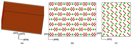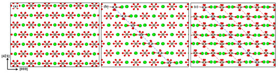 In order to explain the anisotropic mechanical properties of single-crystal calcite, the atomic configurations of tensile deformation and failure processes along the and directions are given in Figure 9 and Figure 10, respectively. No defects occur at the elastic deformation stage along the and directions. Unlike the tensile failure case along the direction, there are a lot of voids that form in advance at the rapid stress reduction stage, as shown in Figure 9b. This phenomenon can also be explained by the arrangement of calcium carbonate molecules. As shown in Figure 8a, the calcium carbonate molecules in the dotted red lines, such as molecules 4, 5, and 6 or 7, 8, and 9, act as a close-packed plane, and are stretched in a direction just perpendicular to the close-packed plane, resulting in a direct separation between the two close-packed planes and the formation of voids. It is more similar to the tensile failure of single-crystal aragonite along the direction [53]. As the strain increases, the voids continue to grow up and phase transition takes place in the center of the model, as shown in Figure 9c. In the new phase, Ca–Ca has the nearest neighbor distance of 3.4 Å, which is different from the phase with the Ca–Ca nearest neighbor distance of 3.2 Å shown in Figure 4c.