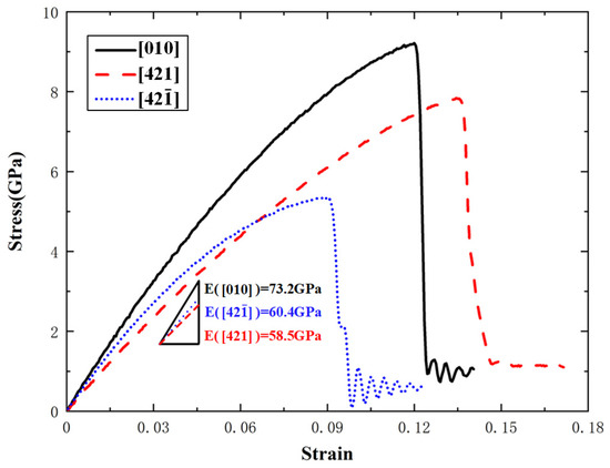 Figure 3 shows the uniaxial tensile stress–strain curves along the , , and directions at 300 K temperature and 1 × 108 s−1 strain rate. It can be seen that although the three stress–strain curves have very similar shapes, they obviously have different slopes of the elastic stage, different ultimate stresses or fracture strength, and different strains corresponding to the ultimate stresses. This reflects the remarkable anisotropy of single-crystal calcite in the mechanical properties. At the stage of elastic deformation, the stress increases with the strain in an approximately linear trend. When the fracture strength is reached, the curves enter into the fracture stage. The results indicate that the tensile failure behavior of single-crystal calcite exhibits typical quasi-brittleness characteristics along the three directions [47]. By fitting the elastic deformation stage with the least square method, the elastic modulus along the direction is about 73.2 GPa, which is very close to the experimental result of 70.23 ± 1.35 GPa [48]. Moreover, the elastic moduli along the and directions are 58.5 GPa and 60.4 GPa respectively. They are about 20% smaller than that along the direction.
