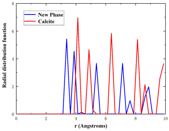 Radial distribution functions of Ca–Ca for calcite in red and the new phase in blue.