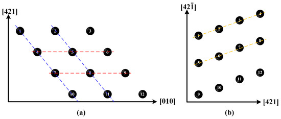 Figure 8 shows the layouts of computer model on the top plane and side plane. In this figure, each point has the average coordinates of the five atoms in the corresponding calcium carbonate molecule. When the model is stretched along the direction, as shown in Figure 8a, the calcium carbonate molecules in the dotted blue lines, such as molecules 1, 4, 7, and 10 or 2, 5, 8, and 11, act as a close-packed plane. There is a high molecular density on these planes. Due to large distance between two neighboring close-packed planes, there is a weak atomic binding force and a small slip resistance between them, so that the slip preferentially occurs.