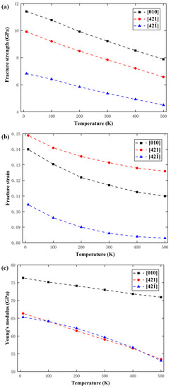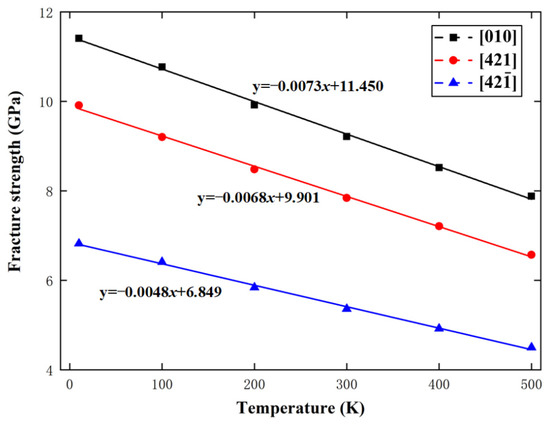 As with other inorganic materials, the mechanical properties of calcite are affected by temperature and strain rate [54,55]. In order to study the effect of temperature on the deformation behavior, the strain rate was fixed at 1 × 108 s−1 but the temperature was changed from 10 K to 100 K, 200 K, 300 K, 400 K, and 500 K. Figure 11 shows the variations of fracture strength, fracture strain, and elastic modulus with temperature along the , , and directions. At 10 K, the fracture strength, fracture strain, and elastic modulus are 11.41 GPa, 0.140, and 76.35 GPa along the direction, respectively; they are 9.91 GPa, 0.149, and 66.34 GPa along the direction, respectively; but they are 6.82 GPa, 0.104, and 65.31 GPa along the direction, respectively. Obviously, the mechanical properties are significantly different along different directions, so they are strongly anisotropic. With elevated temperature, the fracture strength, fracture strain, and elastic modulus are all reduced. When the temperature is elevated from 10 K to 500 K, the fracture strength reduces by 32.3%, 34.1%, and 33.8% along the , , and directions, respectively, the fracture strain reduces by 23.3%, 22.6%, and 21.1%, respectively, and the elastic modulus reduces by 12.6%, 19.5%, and 19.1%, respectively.