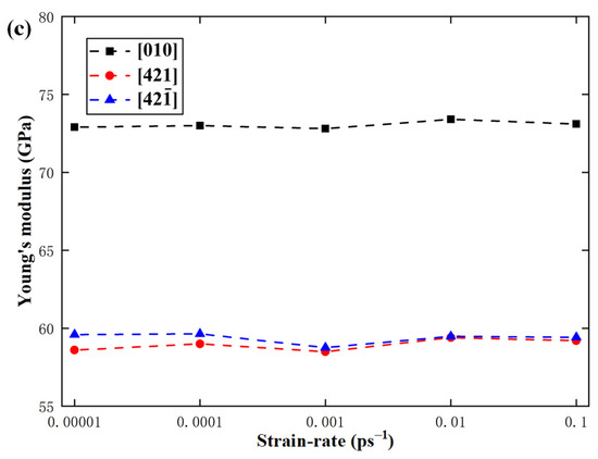 In order to study the effect of strain rate on the mechanical properties of calcite, the temperature was fixed at 300 K, but the strain rate was changed from 0.00001 ps−1 to 0.0001 ps−1, 0.001 ps−1, 0.01 ps−1, and 0.1 ps−1. Figure 13 shows the variations of fracture strength, fracture strain, and elastic modulus with the strain rate along the , , and directions. It can be seen that with the increase of strain rate from 0.00001 ps−1 to 0.1 ps−1, the fracture strength along , , and directions increases by 10.8%, 14.4%, and 13.4% respectively, and the fracture strain along the directions increases by 16.6%, 15.6%, and 17.2% respectively. It can be seen that both the fracture strength and fracture strain increase monotonously with the increase of strain rate. However, the strain rate hardly has any effect on the elastic modulus.