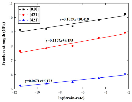 Variations of fracture strength with logarithmic strain rate along the , , and directions.