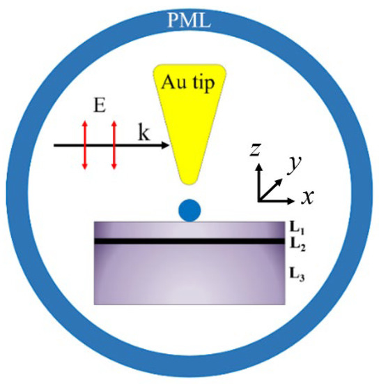 Numerically, we firstly build hybrid geometry of the tip-substrate system, in which three layers graphene sheets with thickness of 1 nm are embedded in the substrate. Here, the graphene with respect to the Fermi energy modifications are modeled with the surface optical conductivity considering the intra and inter band contributions [32,33]. Then the hybrid tip-substrate geometry, ambient medium is divided into many small meshes. The Helmholtz equation is discretized at every mesh point to form a large sparse matrix on the defined geometry. A perfect matching layer (PML) is set outside of the tip-substrate geometry. The scattered light from the tip-substrate is totally absorbed through the PML in the far field [Figure 1]. The boundary condition at the interface between the graphene sheet and Silica substrate is treated as a continuous one. We obtain the numerical solutions of the Helmholtz equation and optical force modeling via Commercial soft of COMSOL Multi-physics. Under the investigation, we will focus on the localized electric field enhancement behavior by introducing graphene sheet for plasmon trapping for 10 nm Au sphere via designing the graphene-hybridized Silica substrate for high-stability trapping purposes. In addition, this self-consistently modeling can possibly be enlarged for other 2D nanomaterials in addition graphene sheets, like honeycomb XBi and XBi3 sheets for advanced molecular scale plasmon trapping [34].