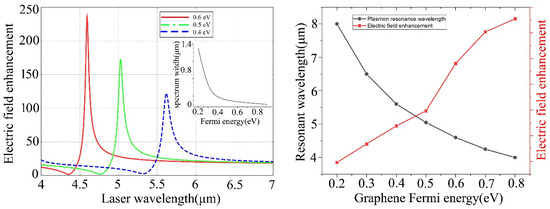 Figure 2 shows the localized electric field enhancement spectrum with respect to the Fermi energy modification of a graphene sheet for the graphene-hybridized tip-substrate system. The graphene sheet is sandwiched in between the surface Silica film layer and Silica substrate. The trapping target is considered as a molecular-scale Au sphere with a diameter of 10 nm. It can be observed that, as a planar wave laser is horizontally incident on the tip-substrate system, the localized electric field enhancement defined as |E/E0| can achieve values as high as 240 at wavelength 4.65 μm by applying Fermi energy of 0.6 eV, as seen in Figure 2a. Also, the plasmon resonance wavelengths of the localized electric-field enhancement spectrum fall into the mid-infrared regime for the modified graphene Fermi energy of 0.4 eV, 0.5 eV and 0.6 eV, respectively. More interestingly, the electric-field enhancement spectrum profile width (Spectrum width) in the testing way of full width at half maximum (FWHM) becomes narrower by applying higher Fermi energy of the graphene sheet at 0.6 eV, as seen in the inset of Figure 2a, which is essentially important for high-sensitive wavelength-dependent sensor applications. We can see from Figure 2b that, as the applied Fermi energy of the graphene sheet increases from 0.2 eV to 0.8 eV, the localized electric field enhancement of |E/E0| can be remarkably further elevated for an even higher Fermi energy of 0.8 eV. Simultaneously, the plasmon resonance wavelength obtains an obvious blue-shift from 8 μm to 4 μm. The scale law of resonance wavelength vs. Graphene Fermi energy as EF−1/2 for a given wavevector q typically appears in the current result, originating from the intrinsic interband contributions to static graphene screening, which can be effectively absorbed in a background dielectric constant [28]. Also, the simulations show that the typical infrared resonance spectrum will totally disappear as the graphene sheets are removed. The electric-field enhancement spectrum with respect to modifying the graphene Fermi energy can be substantially helpful for a good understanding of the tunable-spectral properties of localized electric field enhancement exerting on the molecular-scale Au sphere target, which plays an important role in affecting the plasmon trapping properties on the diffraction-limit broken nanoscale for the graphene-hybridized tip-substrate system.