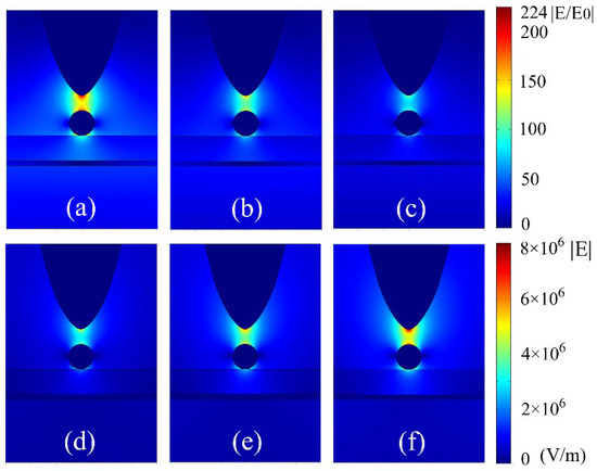 The 2-D images of localized electric-fields for the designed graphene-hybridized tip-substrate system with respect to Fermi energy of graphene sheet and external laser excitation. The Fermi energy is taken as 0.6 eV, 0.5 eV and 0.4 eV for (a–c), respectively. The Fermi energy is taken as 0.5 eV, and the electric field amplitude of external laser excitation is set as 3.5 × 104 V/m, 4.5 × 104 V/m and 5.5 × 104 V/m for (c–f), respectively. The trapping Au sphere diameter is 10 nm, and the thickness of the surface Silica film layer is 15 nm.