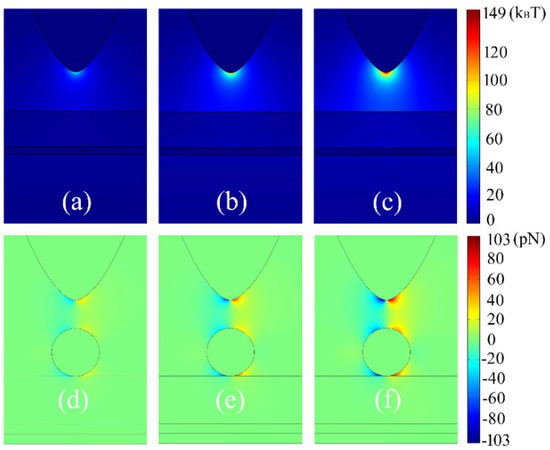 The plasmon trapping properties of potential well (a–c) and trapping force (d–f) with respect the electric field amplitude of external laser excitation. The trapping sphere diameter is 10 nm, the thickness of Silica film is 10 nm. The external laser excitation electric field amplitude is 3.5 × 104 V/m for (a,d), 4.5 × 104 V/m for (b,e), 5.5 × 104 V/m for (c,f), respectively. The Fermi energy of graphene sheet is 0.6 eV, the thickness of the surface Silica film is 15 nm.