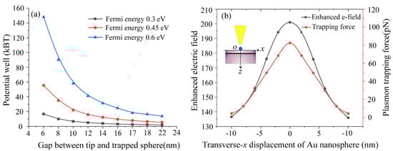 The plasmon trapping potential well and trapping force with respect to tip-to-sphere gap and the transverse displacement of Au nanosphere for the graphene-hybridized tip-substrate system. The trapping sphere is taken as 10 nm in diameter. We can see from (a) that the plasmon trapping potential extracting from vertex of the Au sphere drops rapidly as the tip-to-sphere gap increases from 6 nm to 14 nm for the graphene sheet Fer-mi energy of 0.6 eV. The plasmon trapping force as a function of the transverse displacement of Au nanosphere along surface of Silica substrate is shown in (b).