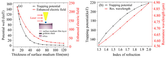 The plasmon trapping potential for the graphene-hybridized tip-substrate system with respect to the different surface medium film layers for the Silica substrate. (a) different thickness of surface medium film layer; (b) different index of refraction for the medium film layer. The trapping sphere with diameter of 10 nm is considered as the trapping target here. The applied Fermi energy for the graphene sheet is taken as 0.6 eV.