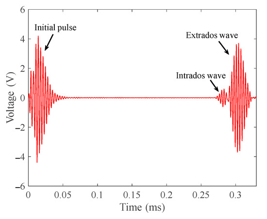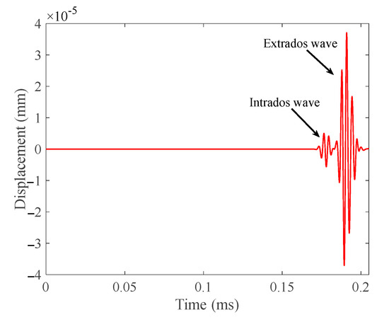 In Figure 14, there are two waves with different energy. The first wave has small energy, while the second wave has large energy. The time of their arrival at the receiver is very close to the theoretical calculation. The amplitude ratio of the first wave to the second wave is 16.33%, which is very close to the 14.35% amplitude ratio of the first wave to the second wave in the stimulation signal. Therefore, T (0, 1) mode-guided wave is separated from intrados and extrados waves after passing through the bend. The energy of the wave is concentrated in the extrados of the bend. Due to the difference in the propagation path, the intrados wave is received before the extrados wave.