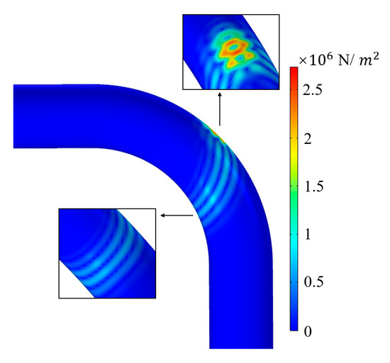 The energy distribution diagram is shown in Figure 4. It can be seen from the cloud diagram that most of the energy of the guided wave was concentrated in the extrados of the bend. The phenomenon of intrados and extrados wave separation and uneven energy distribution of guided waves has an impact on defect detection at different circumferential positions of the bend. Therefore, we needed to perform finite element simulations of defective bends to verify the ability of T (0, 1) guided waves to detect defects in the bend.