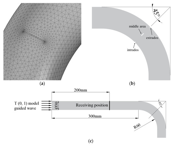 In order to verify the ability of the T (0, 1) guided wave to detect defects at the bend, a notch defect was simulated by removing elements. A defect of 10 mm long, 0.5 mm wide and 1 mm deep was created, as shown in Figure 5a,b. We arranged the defect at 45° of the pipe bend. Defects in the intrados, middle area and extrados of the bend were removed, respectively. The receiving position was set to receive the defect echo signal, and its layout is shown in Figure 5c.