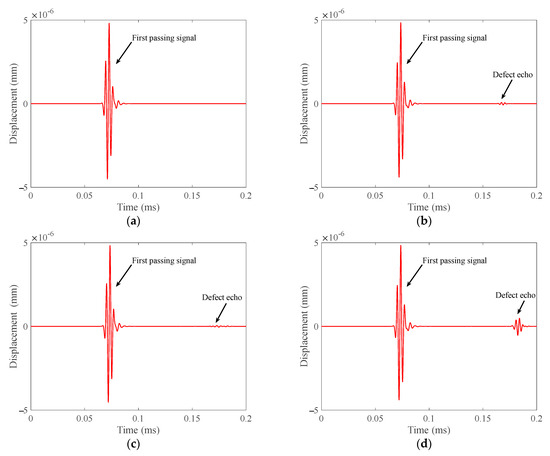 The signals received in the notch defect detection experiments are shown in Figure 15. According to the calculated dispersion curve, when the excitation frequency is 320 kHz, the group velocity of the T (0, 1) mode-guided wave is about 3066 m/s. According to the calculation, the end echo should appear at a time of 0.2674 ms. In the waveforms of the four signals, the echoes appear at 0.2740 ms, 0.2752 ms, 0.2734 ms and 0.2726 ms, respectively. The calculated wave speeds are about 2993 m/s, 2980 m/s, 3000 m/s and 3008 m/s, respectively. It can be concluded that the waves excited by the transducer are all T (0, 1) mode-guided waves. The amplitude of the defect echo is as follows: