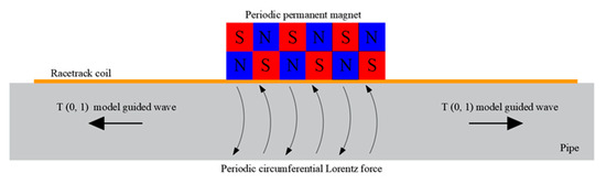 Several PPM EMAT elements form a circular array around the pipe. Each element consists of a racetrack coil and two PPM arrays. Two straight sections of the racetrack coil were placed along the axis of the pipe, on which two PPM arrays were placed. A racetrack coil carries two current parts in opposite directions. Axial eddy currents generate circumferential Lorentz forces in radial static magnetic fields. By controlling the polarization direction of the magnet and the excitation current direction of different elements, the eddy currents on the cross-section are subjected to the Lorentz force in the same circumferential direction. Circumferential alternating vibrations will propagate along the pipe, thus producing T (0, 1) mode-guided waves [31].