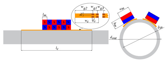 The parameters of the magnets include not only the width of the magnets, the height of the magnets, the length of the magnets and the number of magnet arrays but the placement relationship between the magnets. We used N52 grade magnets and arranged them in an array of six for placement on the six racetracks. The current direction of adjacent coils and the position of the magnets affect the amplitude of the signal. We adopted the method with the largest signal amplitude. This arrangement is to have the current direction of the adjacent coils be opposite, and the direction of the magnet array be exactly opposite. Since the coils used in the experiments consisted of three racetrack coils, we set the current direction of the middle coil to be opposite to that of the coils on both sides and placed the magnet array in the opposite direction [31]. The periodic permanent magnet array and racetrack coil are shown in Figure 10.