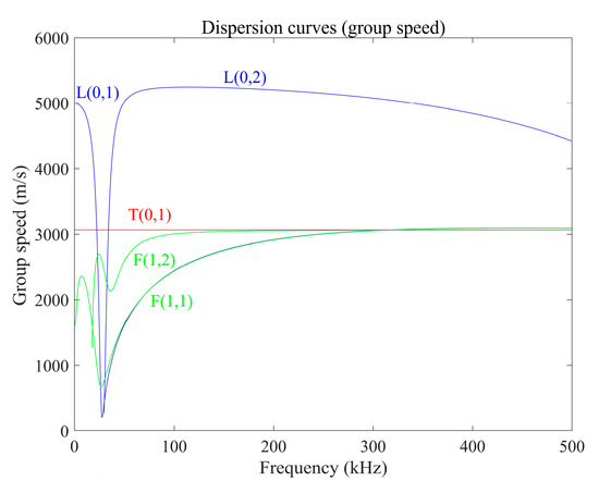 Group speed dispersion curve of an aluminum pipe with an outer diameter of 30 mm and an inner diameter of 27 mm.