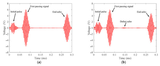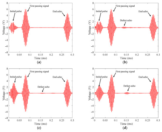 In the four signals, the peak-to-peak values of the passing signals are 12.049 V, 11.982 V, 12.043 V and 12.085 V. The ratio of the peak-to-peak value of defect echo to the peak-to-peak value of the first passing wave are about 2.89%, 2.10% and 3.79%, respectively.