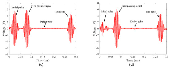 Notch defect echoes received according to the layout in Figure 13b. (a) Defect-free bend; (b) Notch defect in intrados of the bend with a cross-sectional area loss of 3.857%; (c) Notch defect in middle area of the bend with a cross-sectional area loss of 3.857%; (d) Notch defect in extrados of the bend with a cross-sectional area loss of 0.484%.