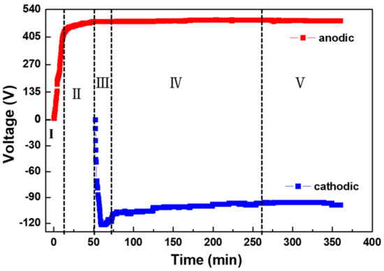 Figure 1 and Figure 2 show the voltage–time curves and the evolution of the discharge during the PEO process, respectively. Figure 1 depicts the five stages of the PEO process according to the characteristics of the voltage variation over time, and Figure 2 illustrates the corresponding features of the discharge at each stage.